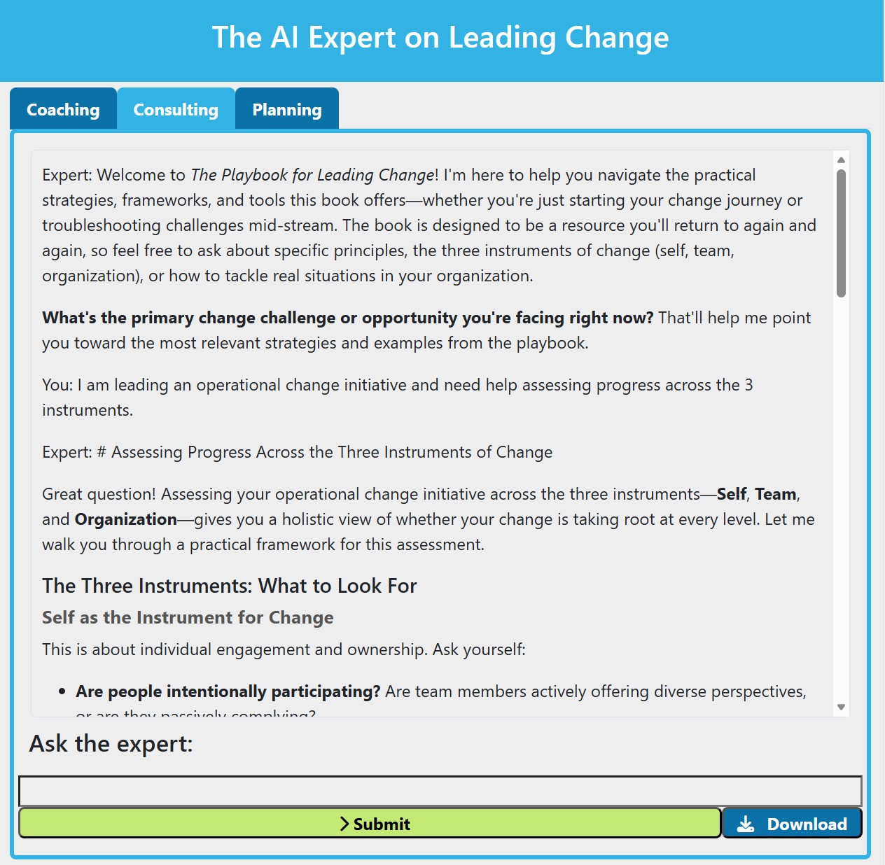 Our proprietary web application leverages AI to help you explore the book's content, customize strategies to your organization's needs, and implement them effectively. It features three interactive modes, offering a dynamic and personalized user experience informed by the book's strategies.